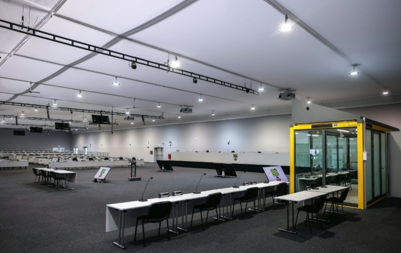 Vorbereiteter Gerichtssaal mit kugelsicherer Kabine