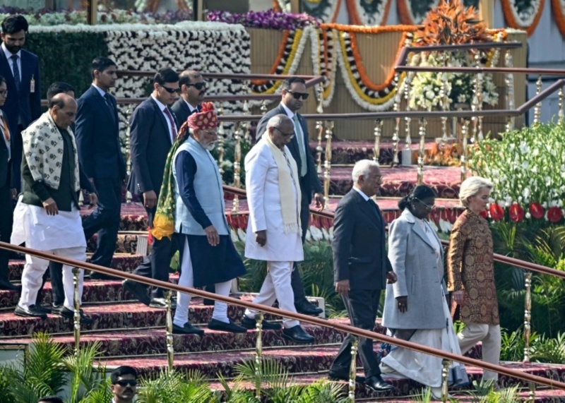 Von der Leyen (r.) und Costa (vorne l.) in Neu Delhi