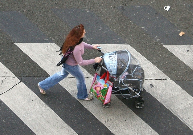 Frau mit Kinderwagen auf einem Zebrastreifen