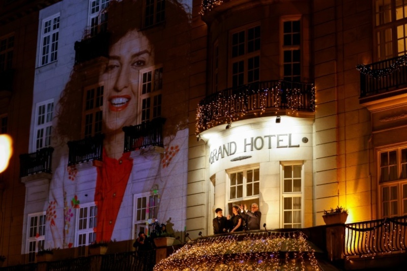 Auf Hausfassade projiziertes Bild von Narges Mohammadi