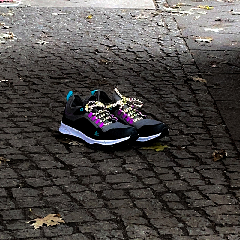 In die schwarzen Schnürsenkel von Reflective Berlin (ab 13 Euro) wurde weißes Reflexgarn gewoben Foto: Reflective Berlin