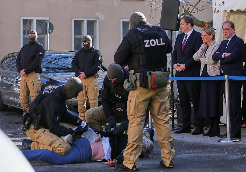Lars Klingbeil, Stefanie Hubig und Alexander Dobrindt bei einer praktischen Einsatzvorführung durch Spezialkräfte des Zolls am 25.02.2025, via dts Nachrichtenagentur