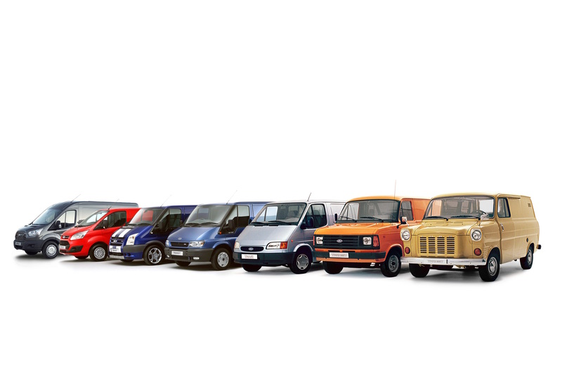 Sechs Generationen auf einen Blick – Der Transit befindet sich seit 1965 auf Wachstumskurs, im Format und im Absatzerfolg. Foto: Ford