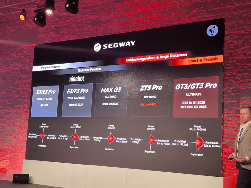 Fünf neue E-Kickscooter-Baureihen hat Segway-Ninebot Anfang 2025 in Köln vorgestellt. Alle fünf werden in diesem Jahr in Deutschland neu auf den Markt kommen Foto: SP-X/Mario Hommen