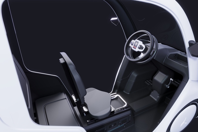 Das Dreirad bietet im Innenraum einen Pedalantrieb und ein Doppel-Lenkrad. Wobei der obere Lenkkranz als das eigentliche Lenkrad und der untere als Bremse dient Foto: Hopper Mobility
