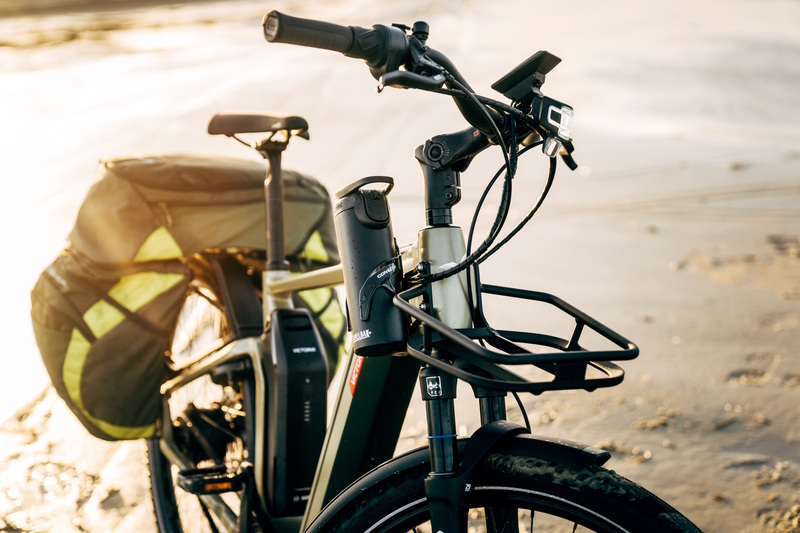 Optional gibt es noch einen kleinen Frontträger, der sich am Head-Tube-Mount-System am Steuerrohr befestigen lässt, das außerdem die Montage von Adaptern wie einen Getränkeflaschenhalter erlaubt Foto: Hartje