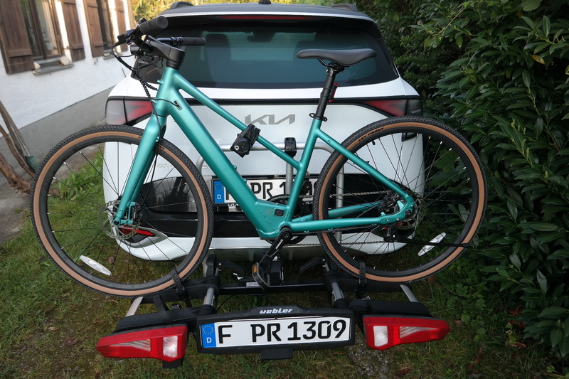 Kein Problem: Das E-Gravel lässt sich leicht auf den Fahrradträger heben Foto: Rudolf Huber/SP-X