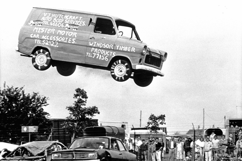 Weiter als alle anderen – Der Stuntman Steve Matthews erzielte 1985 einen Rekord, als er mit einem Transit über 15 Autos sprang. Foto: Ford